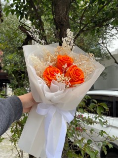 Delicado bouquet de rosas preservadas acompañado de follajes blanqueados, ideal para decorar espacios con un aire romántico y elegante. Su composición natural ha sido tratada cuidadosamente para mantener su belleza entre 1 y 3 años sin necesidad de agua ni cuidados especiales.