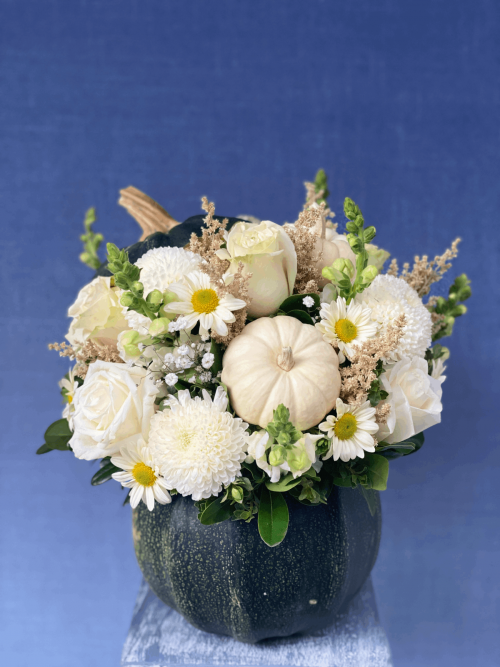 Calabaza blanca con arreglo floral de rosas, margaritas, perritos y mini calabacitas. Un detalle encantador y otoñal para tu hogar o evento.